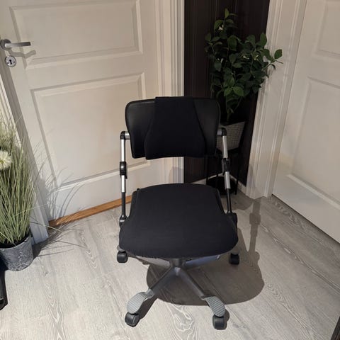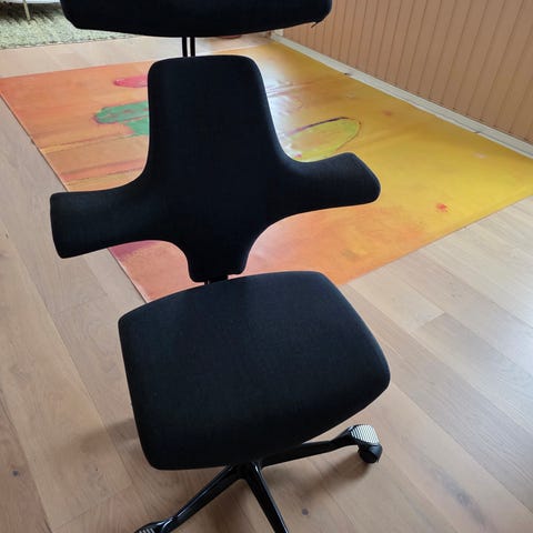 HÅG Capisco 8107 kontorstol med rød stofftrekk i ull og nakkestøtte. Trekket kan tas av og vaskes. Trekket er vasket og ikke brukt siden. Stolen er pent brukt og har ingen synlig slitasje eller nupper i stoffet. Den har tre hendler for justering. Setet kan justeres fram og tilbake, vippefunksjon kan låses og hev/senk funksjonen er intakt.