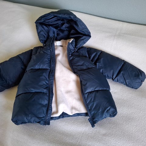 Selger mørk blå lett foret parkas med kunstpels på hetta, str. 92, fra H&M.