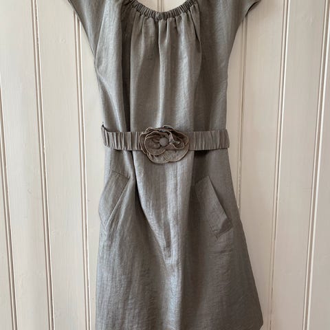 Selger en vakker kjole i str M fra Vernissage. Den er laget av et sort og litt tykt brokadestoff, med sølv og sort "blankt" mønster i. Den er fasongsydd og har strikk under bysten så den sitter pent på. Den har glidelås i siden, brede stropper og 2 stikklommer. Den er ikke brukt, har kun hengt pent i skapet. Se bilder for nærmere detaljer.
