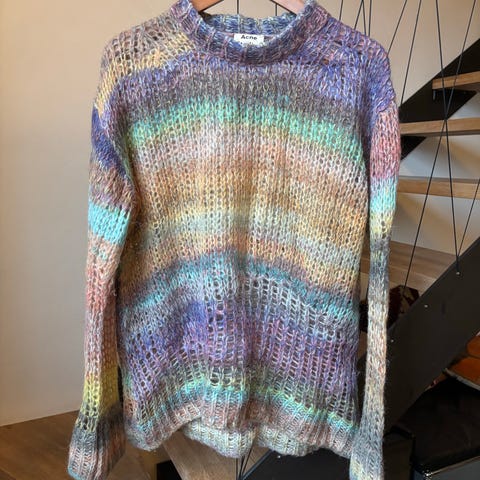 En strikket topp håndmalt i alverdens farger. En størrelse passer nesten alle, opp til XXL. Valerie Lynn er en allsidig designer, med både tekstiler og interiør som felt. Aldri brukt. Helt ny.
