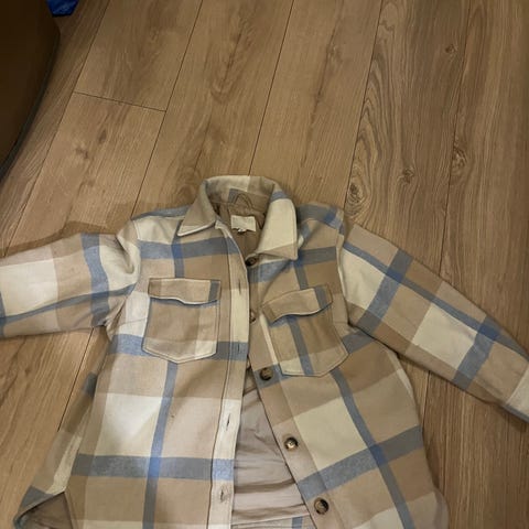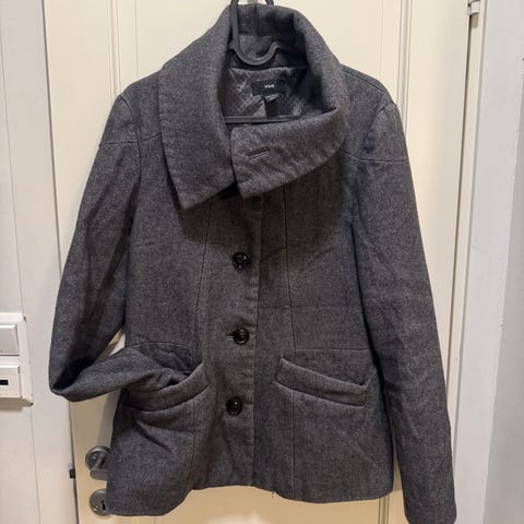 «Ull» jakke fra H&M selges. Står str 44, men oppleves som 40/42. Fargen er riktigst gjengitt på bildet av lappen med størrelsen, mørk gråmelert. Ytterdelen er i 86 % polyester, 13 % viskose og 1 % elastin, gammelrosa for i polyester. Lite brukt, ble for liten. Falt av en knapp, men er med reserveknapp. Noen knapper bør festes bedre, derav prisen. Se gjerne mine andre annonser