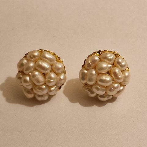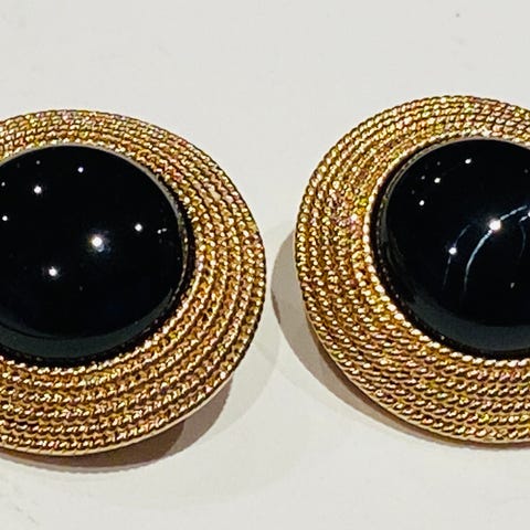 Hjerteformede og store øredobber med svart sten, hvite små perler og klips. Den siste finishen på et retro antrekk. Arvet.