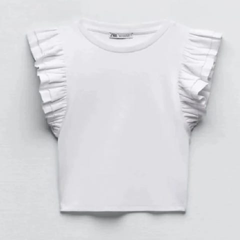 Søt T-shirt/topp fra Zara, Baksiden er lenger og i skjortestoff, mens framsiden er i T-shirt stoff. Brukt kun 1 gang!