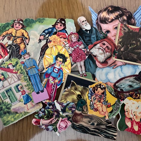 Vintage GLANSBILDER m/glitter, 1960 England, sirkus elefant, hund, bryllup, kake