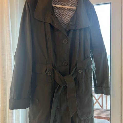 Vår/høstjakke, str, 38/40 og i gråtone Lengde til knærne . Både glidelås og knappelukning foran, samt glidelåslommer. Gjelder Windfeld Summer.
