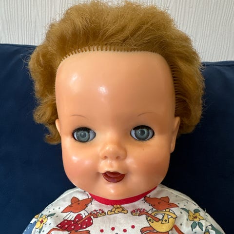 Anne Lise-dukke fra Rayco Vinyl, med sidevipper og hull i munnen. 49 cm. Det ene øyet er litt treigt og litt avskalling av rødfargen på underleppa (se bilde 3). Må hentes.