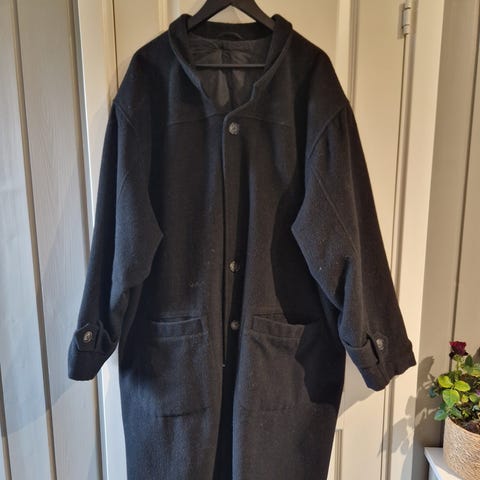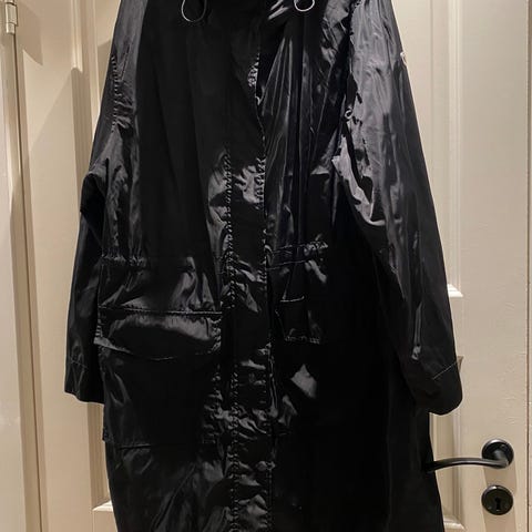 Meget pen tynn kåpe/ jakke fra det italienske eksklusive merket L. Exterior. Meget høy nypris. Størrelse L (italiensk 48). Fargen er sort med blålig skinn i stoffet. Polyester. Knapp foran og stoffbelte i livet. Pent brukt. Lengde fra overkant skulder til skjørtekant ca 85 cm. Omkrets under armer ca 90 cm, liv ca 80 cm. Se også mine øvrige annonser (trykk på min profil for å se annonsene). Billigste porto.