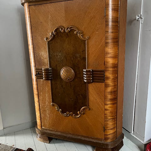 Det er låst, og vi finner dessverre ikke igjen nøkkelen. Vet derfor ikke hvordan den ser ut inni. Vi har ikke forsøkt å få den opp uten nøkkel, men antar det er mulig med litt tålmodighet.