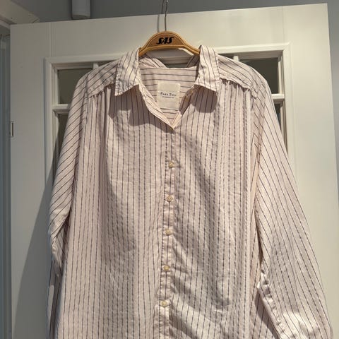 Skjorte fra VILA med artige detaljer. Eggehvit/ lys vanilje med skrift på nedre del på høyre side, og skrift på venstre arm. Armene er 3/4-dels lang, og litt vide, kan strammes med en knapp. Knappelisten er dobbel, så skjulte knapper. (bildet) Skjorten er også litt kort i modellen.