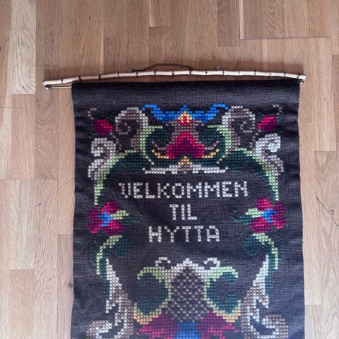 Et koselig brodert velkommen som kan sees ved å komme inn døren. Sydd på bakstykke og helt og fint med oppheng som sees på bilde. Kjøper betaler porto. Kr. 120.Tar vipps. Telf. 40636804