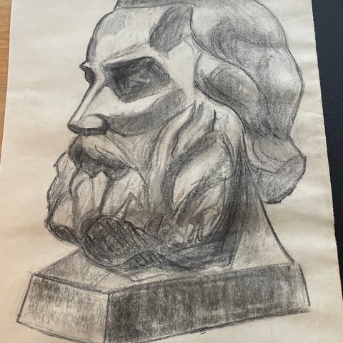 Nydelig kull-tegning sort/hvitt tegning i ramme og glass av et gammelt uthus som fremdeles står på samme plass i øvre Notodden av tidlig 1900 tallet. Denne ble bygd akkurat innenfor gamle bygrensa til Notodden mot Heddal i øvre del av byen.