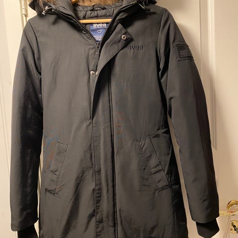 Selger en god og varm vinterjakke fra Svea. Modellen heter Miss Brown. Jakken er mørk grå og har avtagbar pels på hetten. Den er innsvinget med strikk i livet noe som gir fin fasong. Jakken et i strl. m, men er liten i størrelsen.