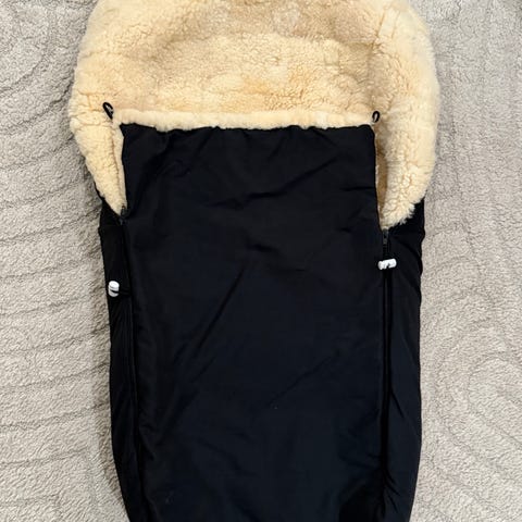 Sort pose med korthåret lammeskinn til baby som kan brukes både i vogn og i bilstol. Pent brukt.