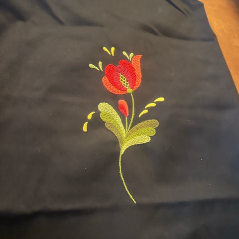 Kjøkkenforkle i rødt, grønt og gull til salgs. Str. S. Nytt. Kan sendes.