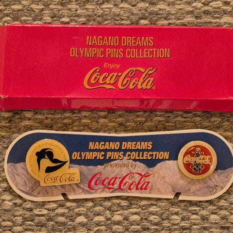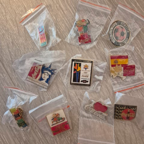 10 Forskjellige Coca-Cola pins selges samlet. Pins fra blant annet OL på Lillehammer 1994, OL i Barcelona 1992, OL i Nagano 1998, Nascar og andre.