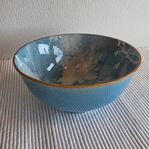 Gammel og solid bolle i håndlaget keramikk. Laget i Norge. Den har noe slitasje innvendig, nederst i bollen, men ellers i veldig god stand. Fra 50/60 -tallet. Diameter: 18 cm. Høyde: 5 cm.