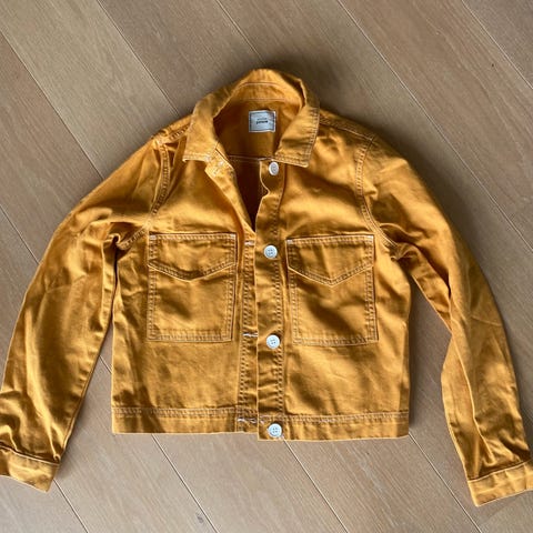 Selger en flott jakke i tynt stoff fra merket Pimkie. Grå og svarte farger på overdelen.