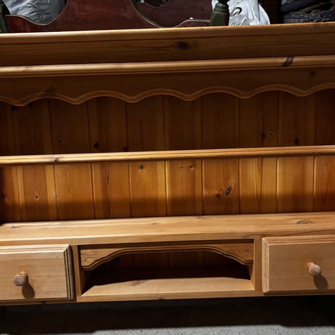 2 hyller og et skap med 2 skuffer under