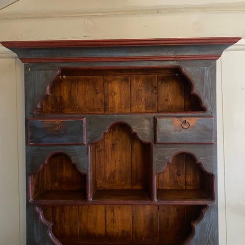 Hyller/skap . Et skap med dører og to skuffer , 2 stk hyller uten dører. Det ene er blåmalt med rød kant, de 2 andre i lys natur. Hyller; Blå kr 350 natur kr 200, skap med skuffer kr 300. Kan selges samlet eller hver for seg.