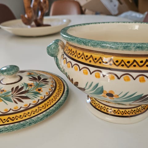 Fat og skål/bolle med lokk i keramikk. Kr 150 pr stk.