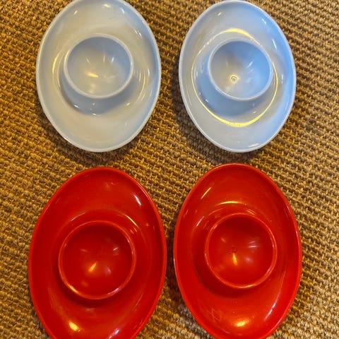 2 gamle fine eggeglass. ca. 6 cm. høye. Det ene har en liten tynn stripe innvendig, men kan ikke se den utvendig. .Ellers i fin stand.....