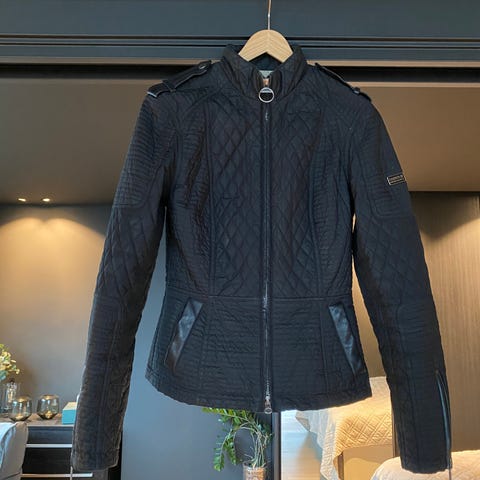 Marineblå vaffeljakke med stramming i livet. Str. S. Stor i størrelsen. Damemodell. Ligner barbour.