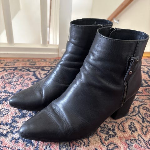 Pent brukt (2 ganger) sorte skinn skoletter. Glidelås på innsiden og stødig hæl. Str 39. Pris som nye kr.1249,-