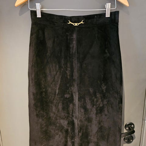 Skjørtet er élégant og feminint. Det er 57% bomull og 47% silke. Det er lett og vakkert å ha på. Det er ca 60 cm langt. Det er litt slitt ved glide låsen, se bildet. Dette synes ikke når man har den på, men for en som kan reparere den.