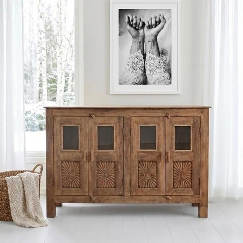 Skjenken er håndlaget av mangotre, som er solid og vakkert, og de håndskårne detaljene legger til dens spektakulære retrostil. Hvert trinn i prosessen utføres med størst omhu, enten det er polering, maling eller lakkering. Håndverket og de vakre trekornene gjør hvert møbel unikt og litt annerledes enn det neste. Designet med 2 hyller, 3 kabinetter og 5 skuffer, har denne skjenken god plass til å holde ulike elementer organisert og innen rekkevidde. Den kan også brukes som oppbevaringsskap eller TV-benk. Stålbenene bidrar til stabilitet og industriell sjarm. Monteringen er enkel.