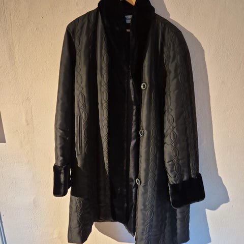 Blå oversized jakke i str.M med krage i fuskepels. Jakken har 2 ytterlommer, glidelås. og belte. Dette er en oversized modell. Den er stor i størrelse og passer nok både M/L.