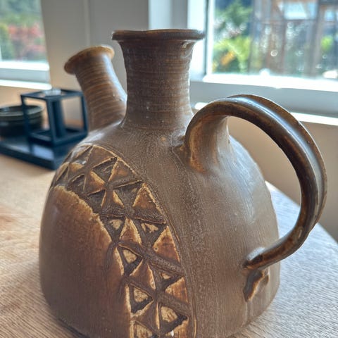 Te-/kaffekanne laget av den danske keramikeren Tue Poulsen. Kannen tilhører serien Sirius, som ble produsert på 1960- og 1970-tallet - med det karakteristiske kvadratiske håndtaket.