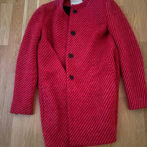 Fin vinterkåpe i ull og nylon og med bomullsfôr, så den er vindtett og ekstra varm. Den er gulnet noe rundt merkelappen (se bilde). Ellers flott og god og varm til de kalde vinternettene.