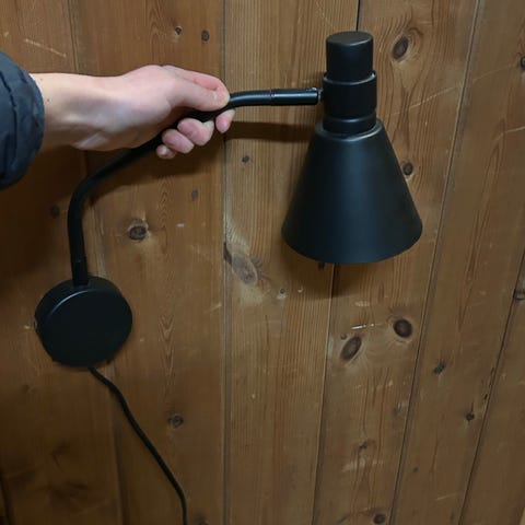 Vegglampe i moderne design som også er fin som leselampe. Av metall. Transparent ledning med strømbryter. Bredde 7 cm. Høyde 20 cm. Veggfestet bygger ut 2 cm og lampen bygger 20 cm ut fra veggen. Stor sokkel E27. Maks. 40W. Veggkontakt.