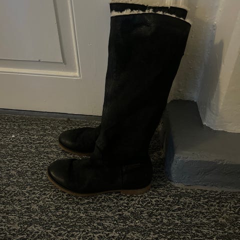 Velur stoff. Tettsittende, går over kneet, flotte støvletter. Størrelse 39
