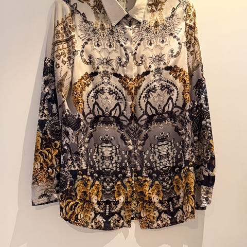 Kjempefin jakke fra Apanage med gråmelerte og offwhite striper og innvevde tråder i kobber og sølv. Lommer i front og frynser på ermer og nedre kant. Lukkes med glidelås i front. Størrelse 40-omkrets bryst er 104 cm, livvidde 98 cm og lengde 50 cm. Pent og lite brukt uten flekker eller skader.