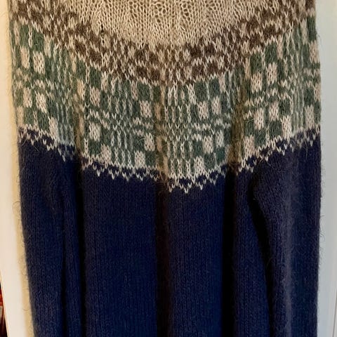 Håndstrikket Fana genser i fargene turkisblå og sort. Str. M. 100% ull. Lengde 70 cm. Bredde 50 cm. Ermer 55 cm. Lengde underarm 49 cm. Kjøpt ferdig strikket. Røyk- og dyrefritt. Kun prøvd. Som ny. Selger kr.899,-.