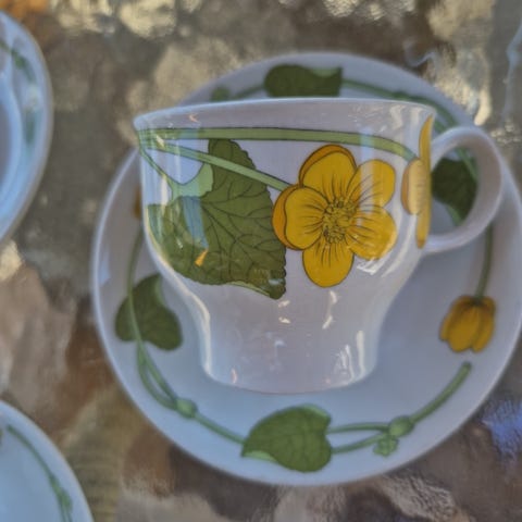 Carl von Linné samlekopper med ulike blomster på. I ganske god stand. Den ene koppen har et lite avslag under, men ellers i god stand.