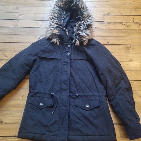Pent brukt jakke fra R&D (kjøpt på Urban). Str. S. Mørkeblå farge. God og varm vinterjakke. Jakken er hel og fin - ingen synlig slitasje eller bruksmerker. Avtagbar hette og pelskant.