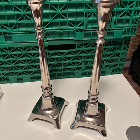Galvaniserte metall lysestaker - 2 stk - 31 cm og 43 cm høye. Perfekte på hytta! Bør hentes.