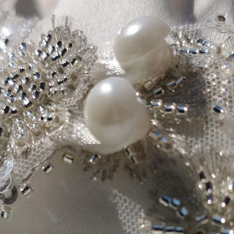 Nydelig med rød detaljer, brodering og bling perler. Følger med brudeslør med bling perler i og et diadem (det må pusses det også )