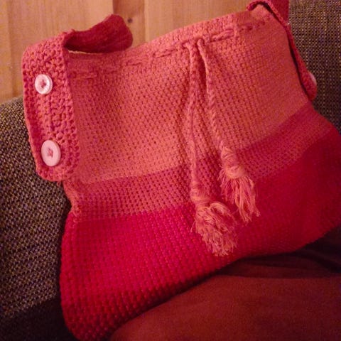 Håndlaget vevd veske med trehåndtak i rosa og lilla stripet mønster. Vesken har et rektangulært design med integrerte håndtak i tre, og er laget av vevd materiale. Passer til hverdagsbruk og lett oppbevaring av personlige eiendeler.