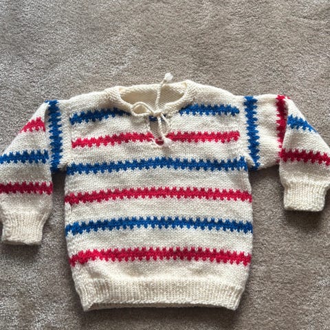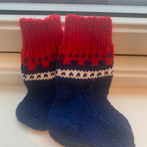 Hjemmestrikkede Marius-strømper i grått,rødt og grønt selges rimelig.