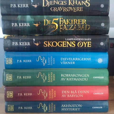 Akhnaton-mysteriet er den første av tre bøker om dette spesielle tvillingparet. Serien heter Lampeåndens barn. P.B. Kerrs har tidligere skrevet spenningsbøker for voksne, men dette er hans første barnebok.