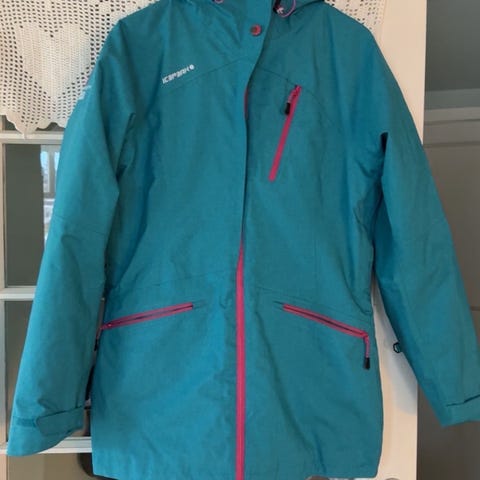 Flott allværsjakke med snø stopper, mange praktiske lommer og hette som kan tas av.