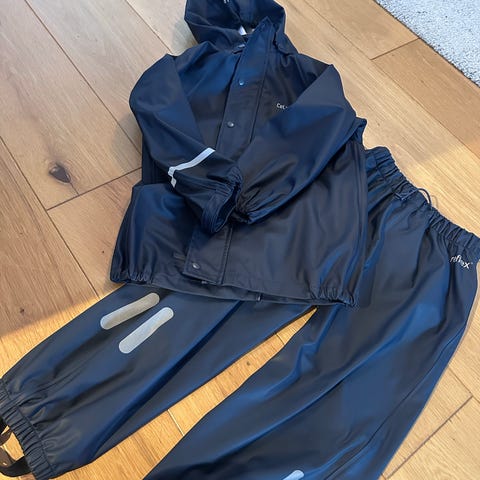 Mørk blå Skofus regnjakke strl 120. Refleks. Hette. Pent brukt, se bilder. NB, Har overstrøket navnemerking inni, se bilde.