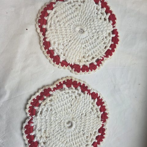 Fine røde og hvite heklede grytelapper