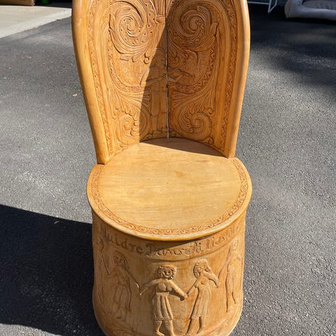 Nydelig kubbestol med treutskjæringer. Hentes på Hafjell / Øyer. Evt. Nesodden etter avtale.