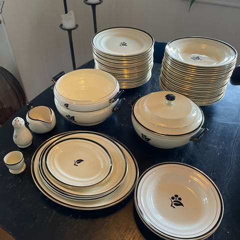 6 flate middag og 6 dype. + sause neb. Litt kanslittasje og få bruksspor. Fra 1937 og ble produsert frem til krigen. Selges samlet for 700,-