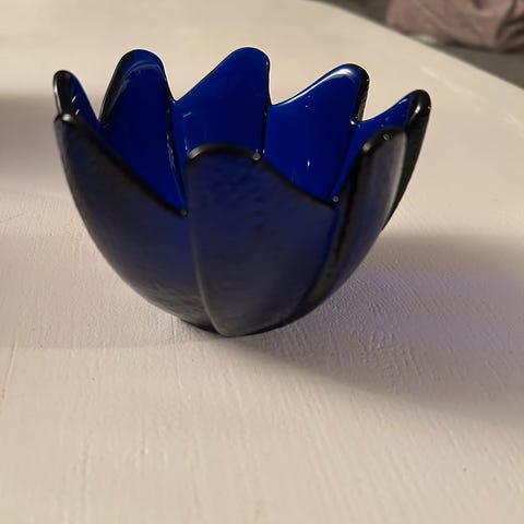 1 flott pynteskål. Koboltblå og med gull. Med «hilsen Melsomvik». H.10cm,L.9 cm