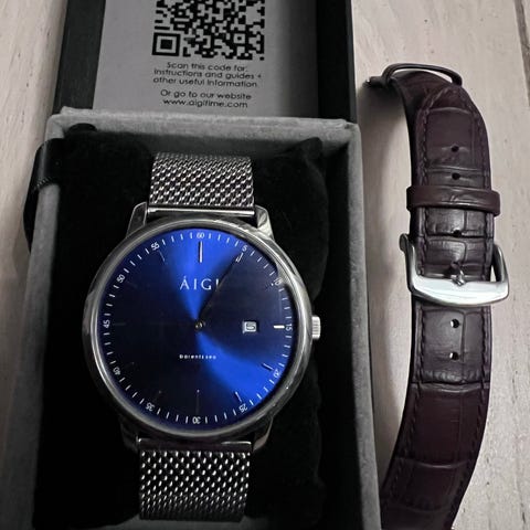 Klokken er ubrukt, da den ble for stor på min hånd. Justerbar reim.